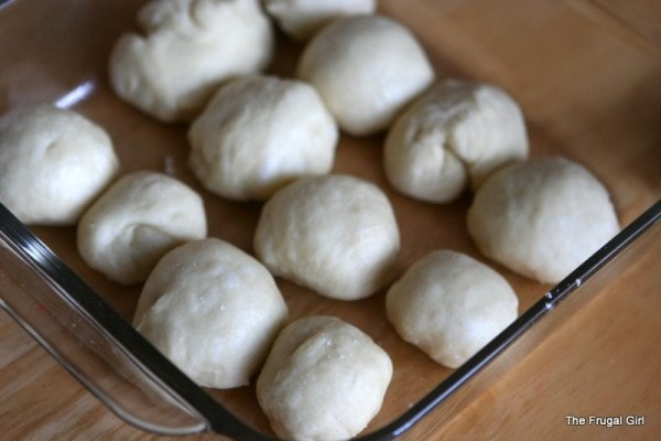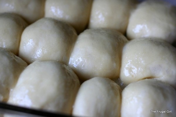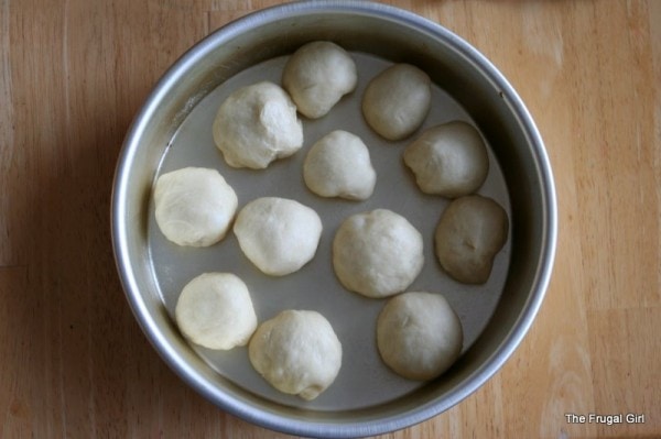 5. Punch dough down and divide into 24 pieces. Roll each piece into a ball, and place balls in two greased 8×8 inch pans or 9 inch round cake pans. Cover and let rise 30 minutes.