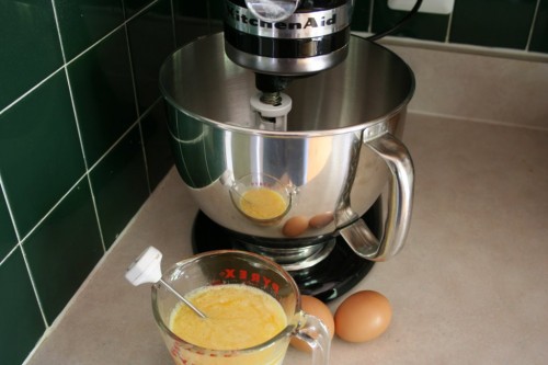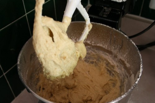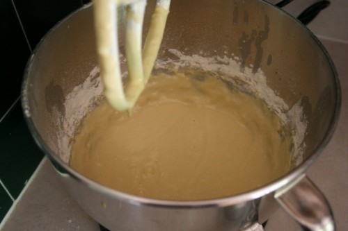 Add the lukewarm milk mixture to the yeast. Add 2 cups of flour and mix well. Add 2 eggs, and mix until combined.