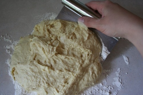 Turn dough out onto a floured surface, and knead until smooth and elastic. I use a bench knife to make this process easier when the dough is first being kneaded and is still rather soft.