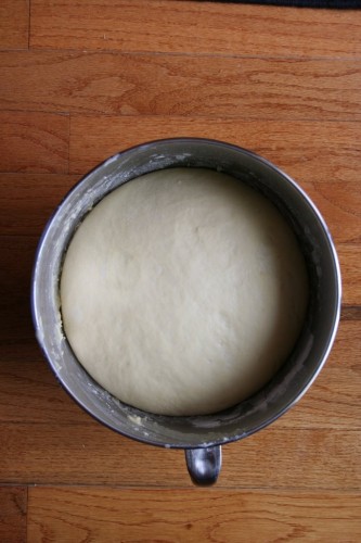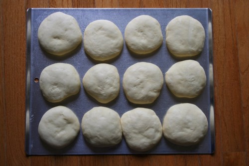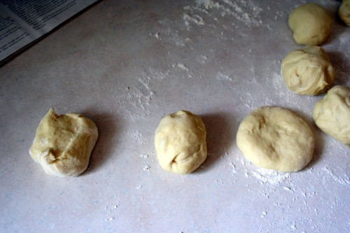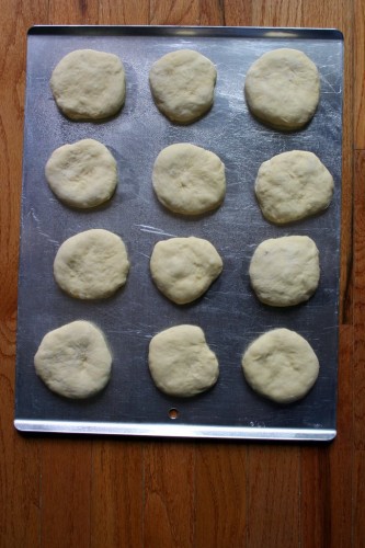 Punch the dough down and turn out onto a floured surface. Divide into 16 equal pieces. Form each piece into a ball, and then flatten each into a disk. Below, from left to right are a divided 16th of the dough, a dough ball, and a flattened disk. Place each disk onto a greased baking sheet, cover with a wet tea towel, and let rise in a warm place for 45 minutes.