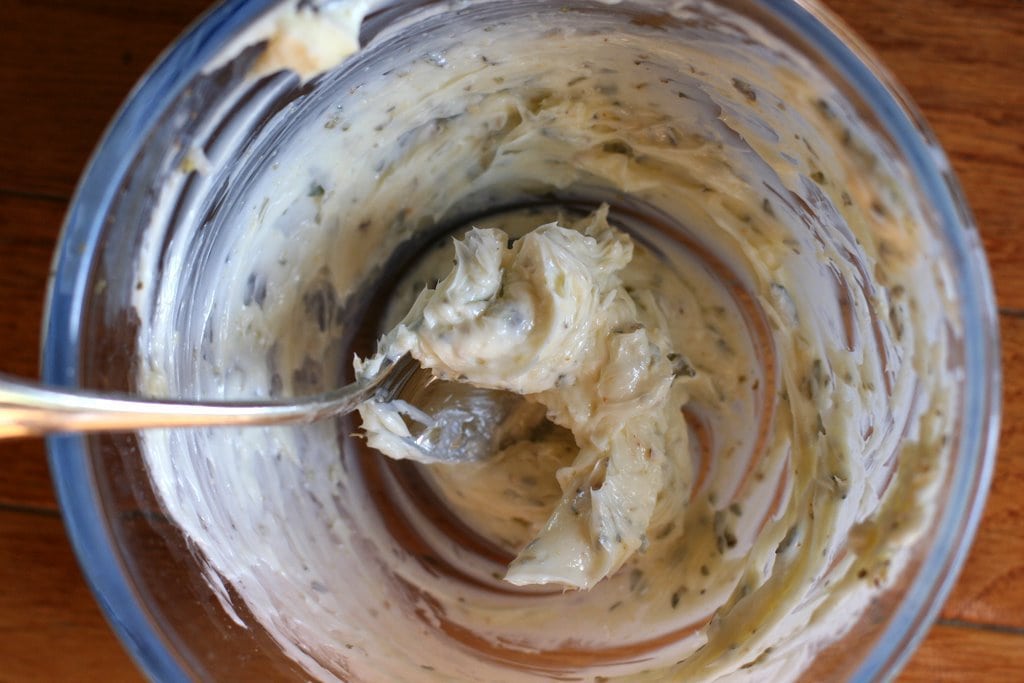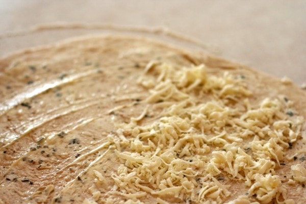 Spread the herbed butter over the dough and sprinkle with mozzarella cheese if desired.