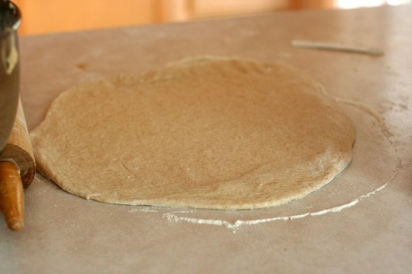 First, roll out your pound of bread dough into a 12×12 inch square.
