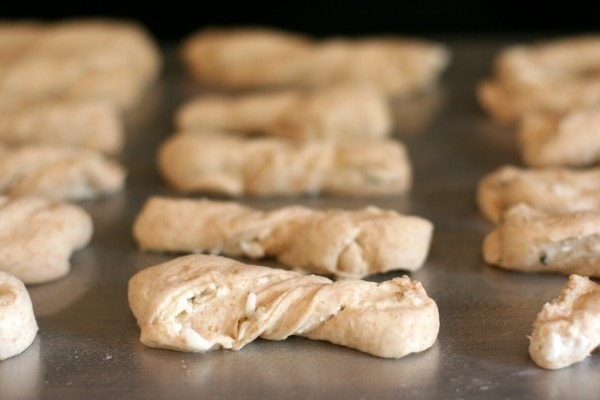 Twist each strip and place onto a greased baking sheet (I use these Vollrath baking sheets.)