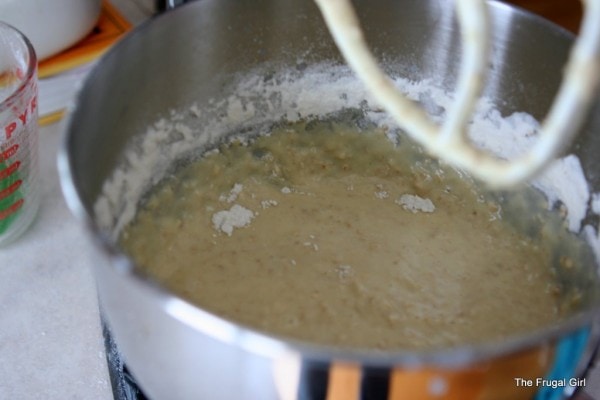 Add oats, milk, butter, 1/2 cup sugar, eggs, salt, and 2 cups flour. Mix on low speed until combine, then mix on medium speed for 3 minutes.