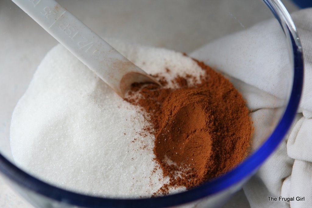 Now it’s time to add the cinnamon. Mix 1/2 cup sugar and 2 teaspoons cinnamon together.