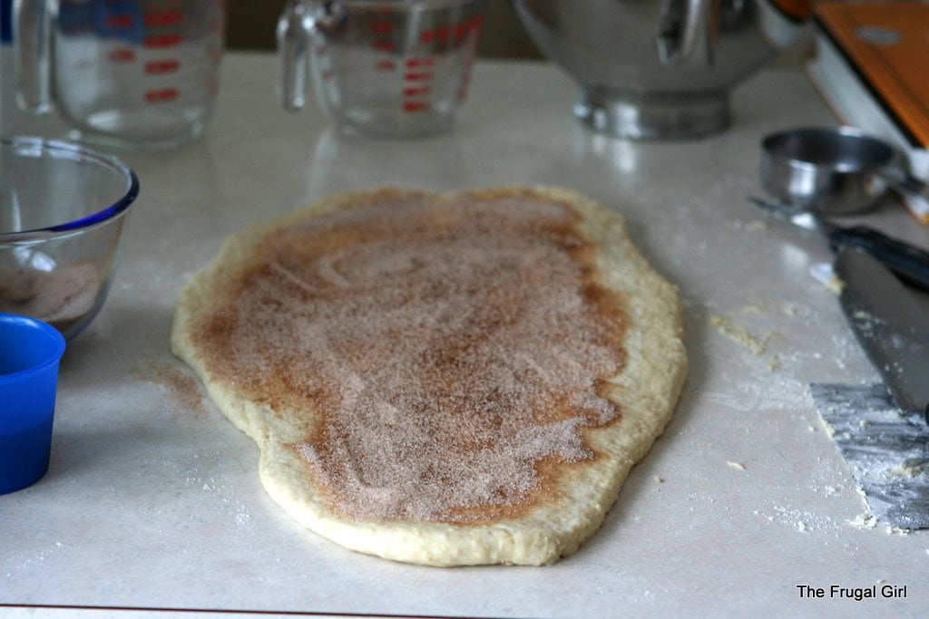 Then sprinkle half of the cinnamon sugar over the dough rectangle.