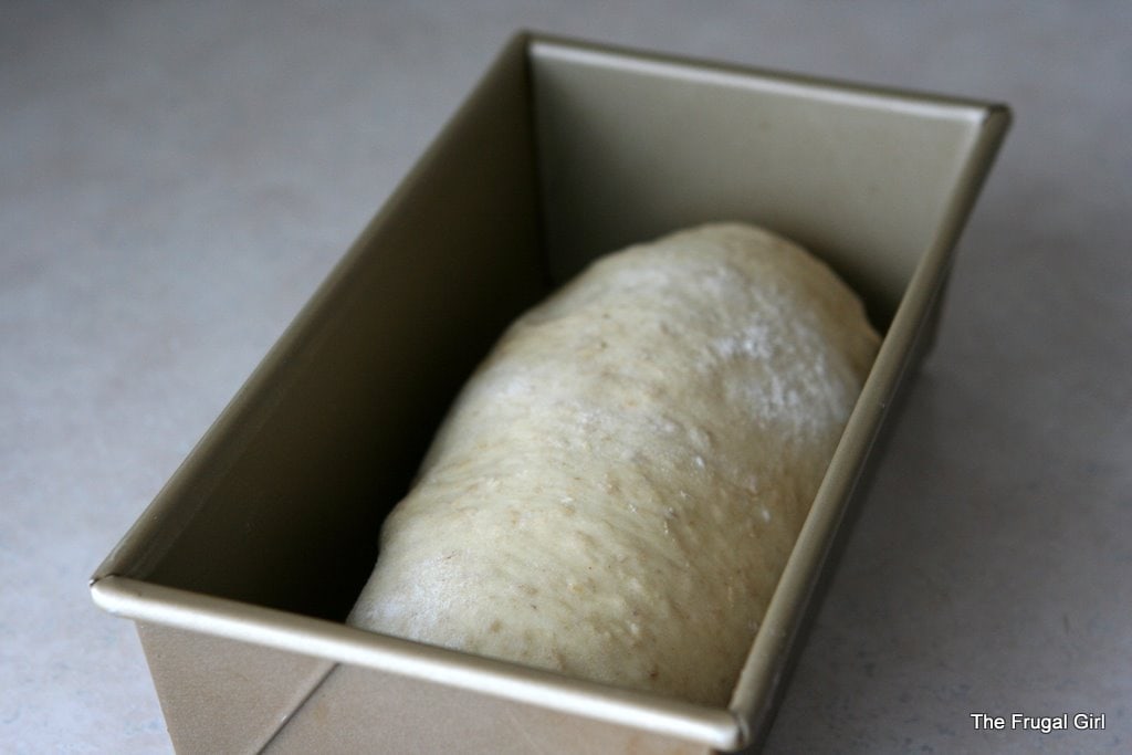 Starting from the short end, roll the dough up, pinch the seam to seal, and place it in a greased 9×5 inch loaf pan.
