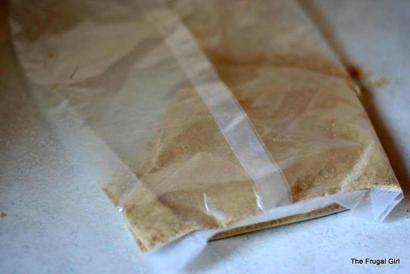 Crush your graham crackers. This is easy to do if you use a rolling pin and a plastic bag. Bonus points to you if you’ve saved a cereal bag for this purpose (cereal bags work better than ziplocs because they are usually more durable).