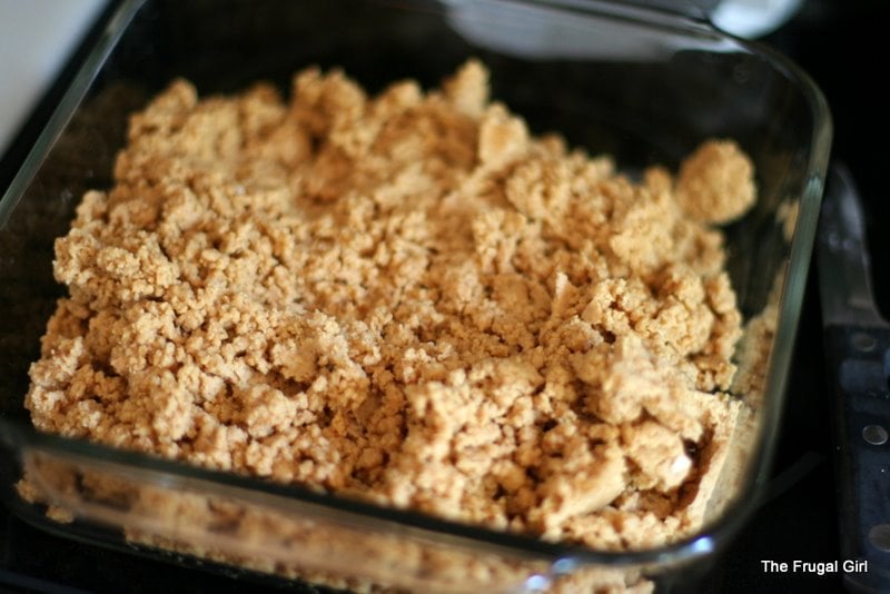 Mix the graham cracker crumbs, powdered sugar, peanut butter, and melted butter together. If you use natural peanut butter, your mixture will look like this.