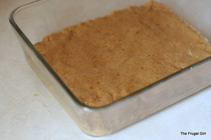 Spread the peanut butter mixture evenly into a 9×9 pan. I don’t have a 9×9 pan, so I use an 8×8 or a 9×7, and it works out just fine. I’d recommend greasing the pan, or if you like, you can line the pan with foil. That way when the bars are chilled, you can easily take them out of the pan in one big square and cut them on a cutting board.