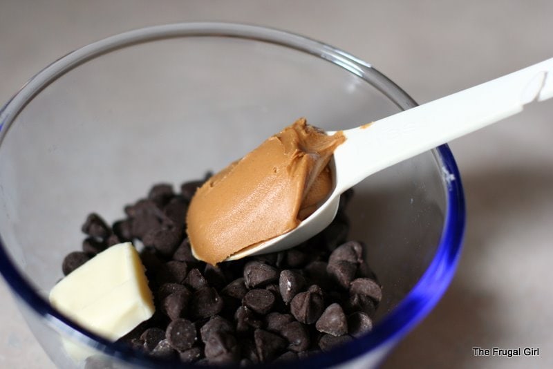 Combine chocolate chips, peanut butter, and butter in a microwave safe bowl. I use a heaping tablespoon of peanut butter, because I really don’t feel like measuring 4 1/2 teaspoons of peanut butter. Seriously, who measures a half teaspoon of sticky peanut butter?? And I use a skinny pat of butter instead of trying to measure a 1/2 teaspoon.