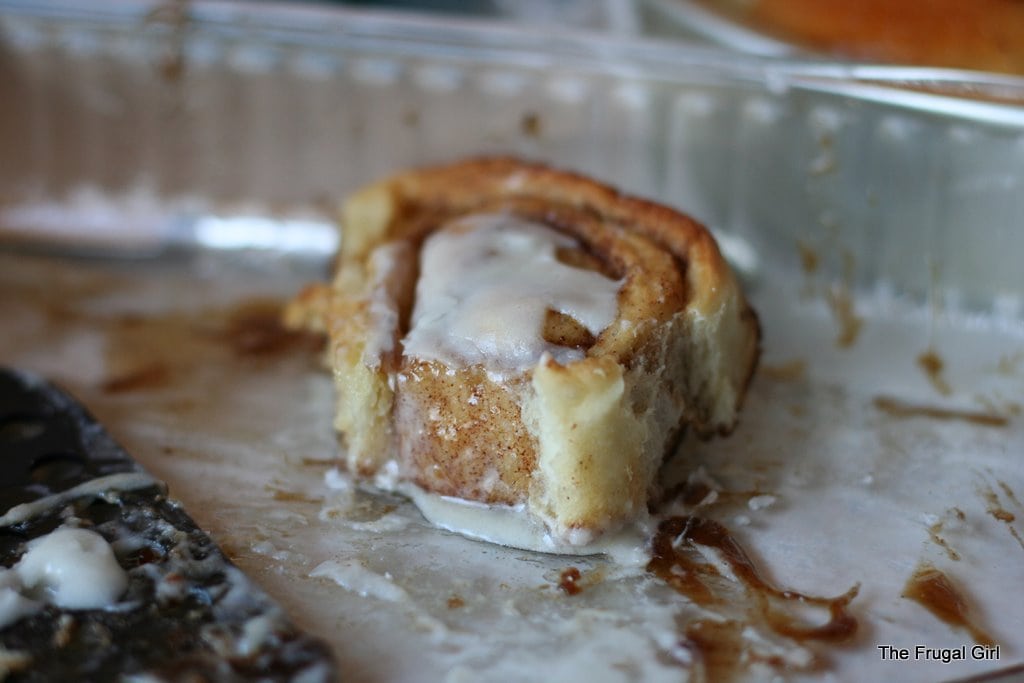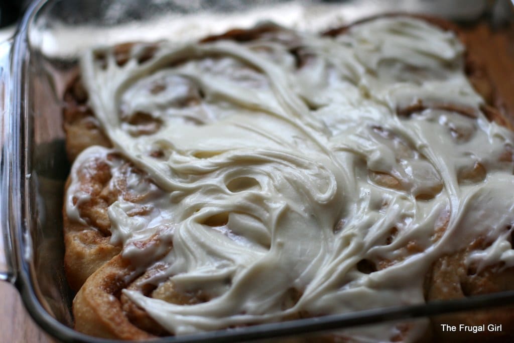 If you’re at all concerned about having leftovers, you can always just frost each roll individually. This will keep you from having to store leftover rolls in the fridge (the fridge dries bread out).