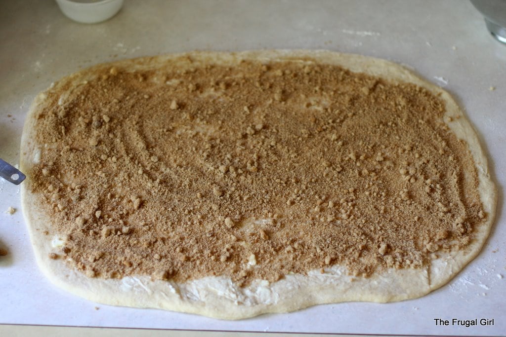 Sprinkle this evenly over the dough. And don’t worry about getting all the lumps out of the brown sugar…a few lumps won’t matter at all.
