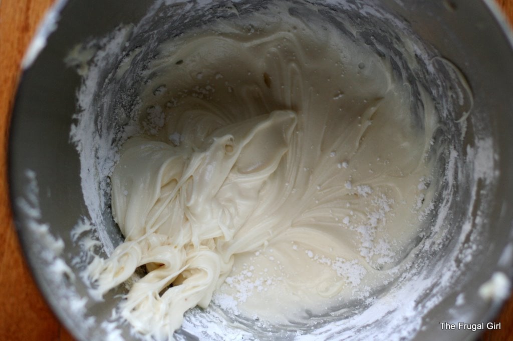 To make the frosting, combine butter, cream cheese, powdered sugar, vanilla, and milk in a mixer bowl. You can do this by hand, but it’s a lot harder that way.