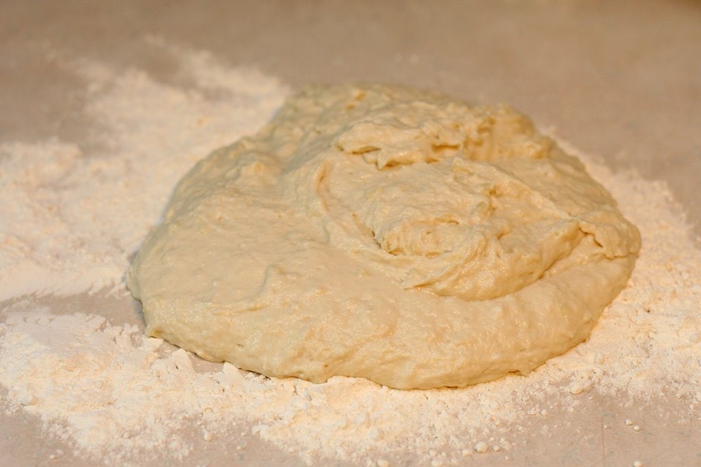 Somehow, I have very few pictures from the early stages of making this dough. I must have forgotten to grab my camera. It’s nothing like rocket science, though…for this dough, you first combine yeast and warm water. If you cooked fresh potatoes, you can use the cooled cooking water (it should be around 110 ° F).