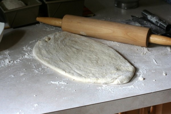 Punch the dough down, turn it out onto your floured counter, and divide it into two pieces. When I shape my dough into loaves, I like to roll it out into an oblong shape and then roll it up, starting from the short side. This produces a loaf with a cleaner appearance inside and out.
