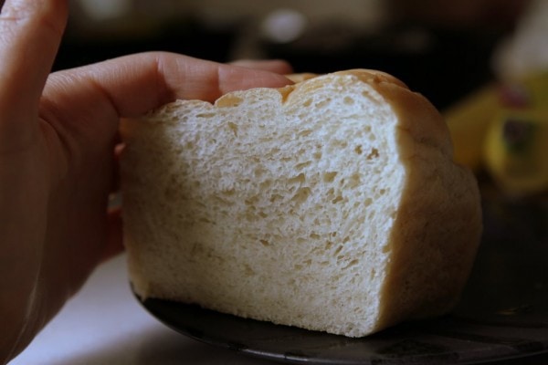 This potato bread doesn’t look a lot like the very yellow commercial versions, but like those breads, it’s very soft. And unlike a lot of homemade breads, these loaves stay soft for a surprising number of days. The loaf I’m squishing in this photo is 2-3 days old.
