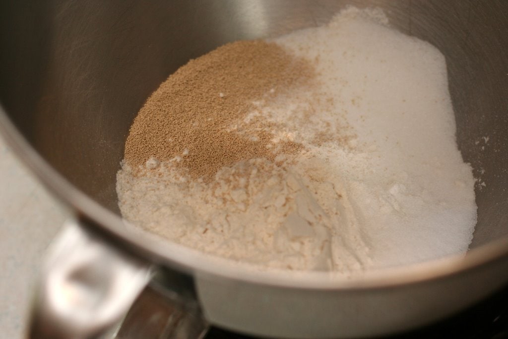 Of course, we start by combining yeast and flour (and also some salt and sugar).