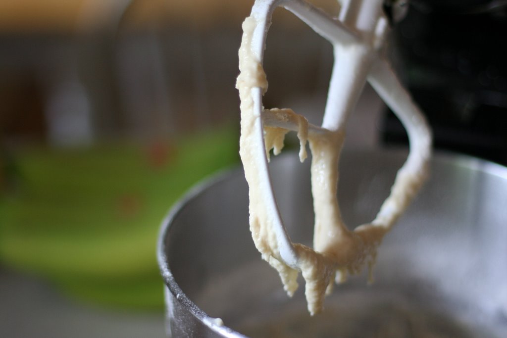 Add the warm milk mixture to the dry ingredients along with an egg, and beat for several minutes.