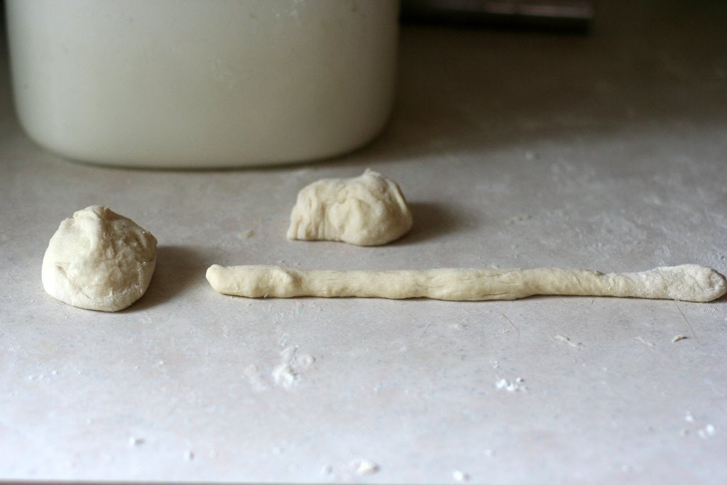 Punch the risen dough down and divide it into 24 pieces. Roll each ball into a 6 inch rope.
