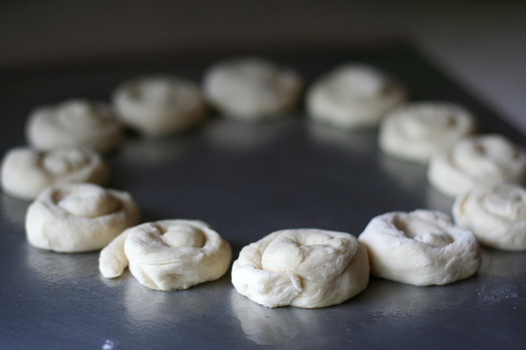 You’ll want to leave a little bit of space between the rolls because they’ll need room to rise. Cover the rolls with the wet tea towel and let them rise for 30 minutes, at which point they should look like this: