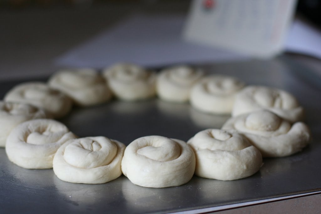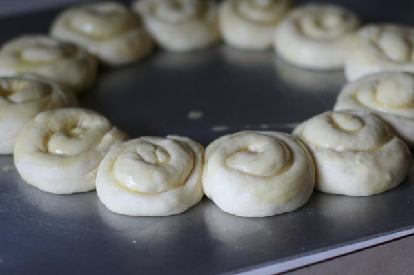 The original directions call for making one ring, comprised of 12 really large rolls, but since we prefer our rolls to be smaller, I make two rings, each composed of 12 smaller rolls. Either way works just fine, so go with your preference.