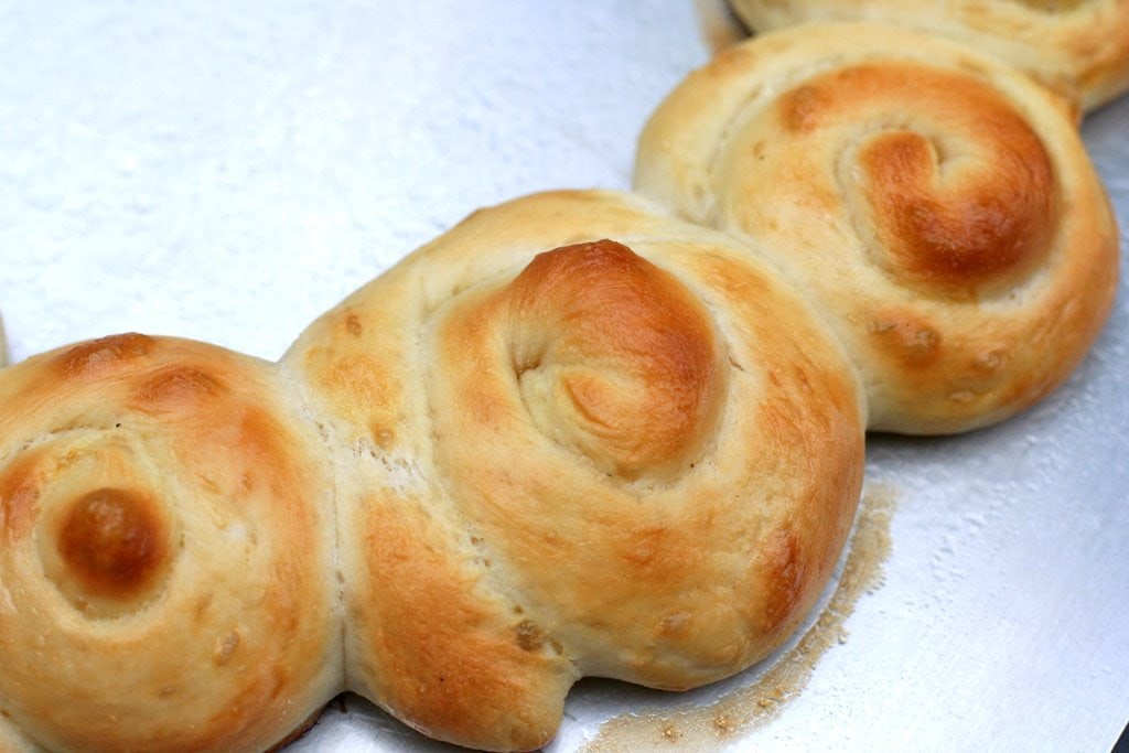 Divide dough into 24 equal pieces. Roll each piece to 6-inch rope. Coil each rope to make “snail” shape. Arrange 12 rolls in a circle on large greased baking sheet with sides barely touching; repeat with remaining rolls. Cover rolls and let rise 30 minutes.