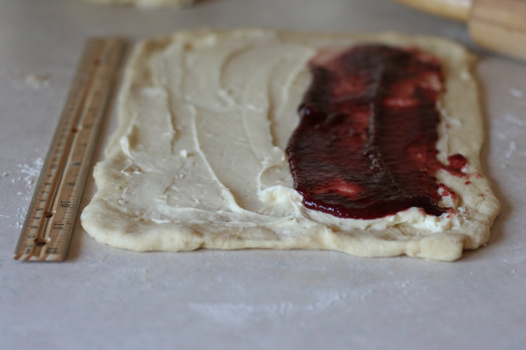 Spread cream cheese mixture over each dough half to within 1/2 inch of the edge. Spread raspberry jam over half of the filling.