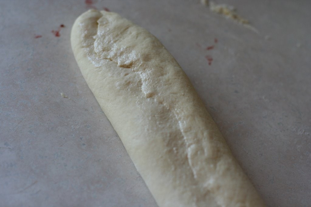 Carefully roll the dough up lengthwise. To seal the seam at the bottom, I like to brush the dough with a bit of water. It works a lot better than pinching the seam.