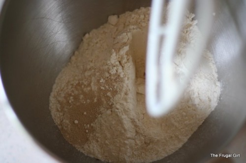 1. In a large mixer bowl, combine 2 1/2 cups of flour and yeast.
