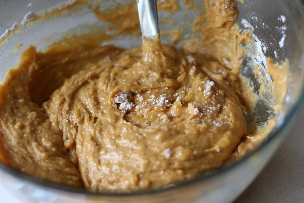 Add the wet ingredients to the dry ingredients, and mix gently, just until everything is almost combined. If you don’t have a few flour bits peeking through, you probably over-mixed. Use a light hand with muffins!
