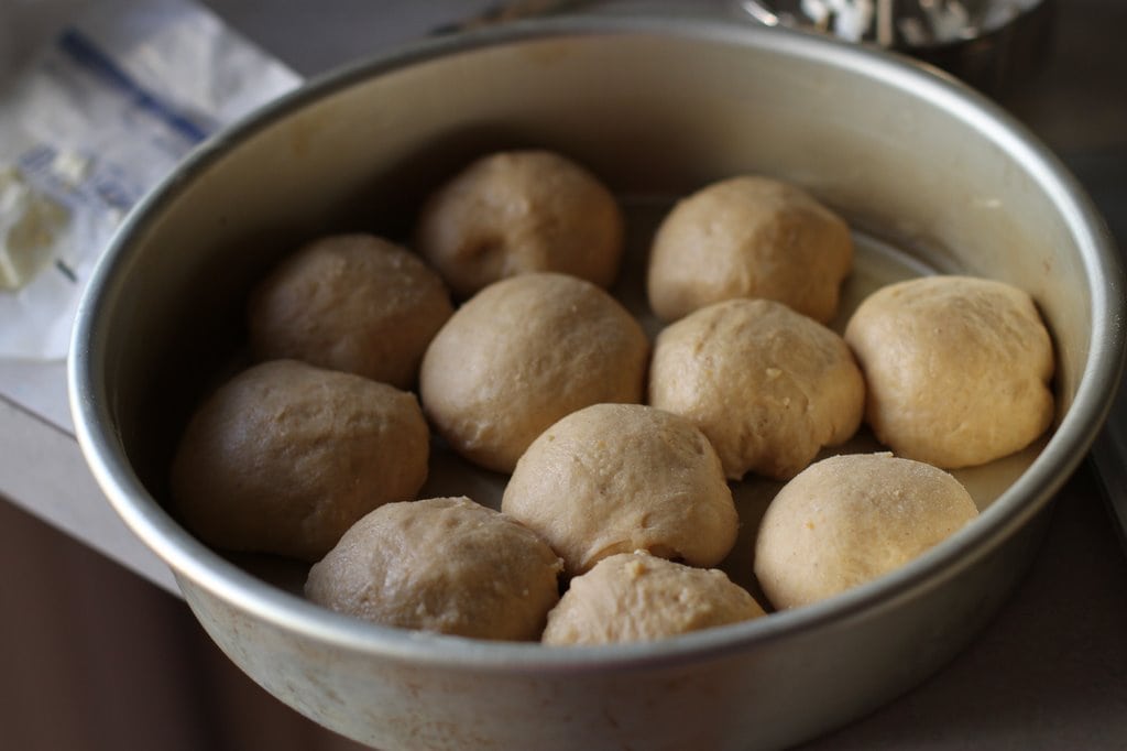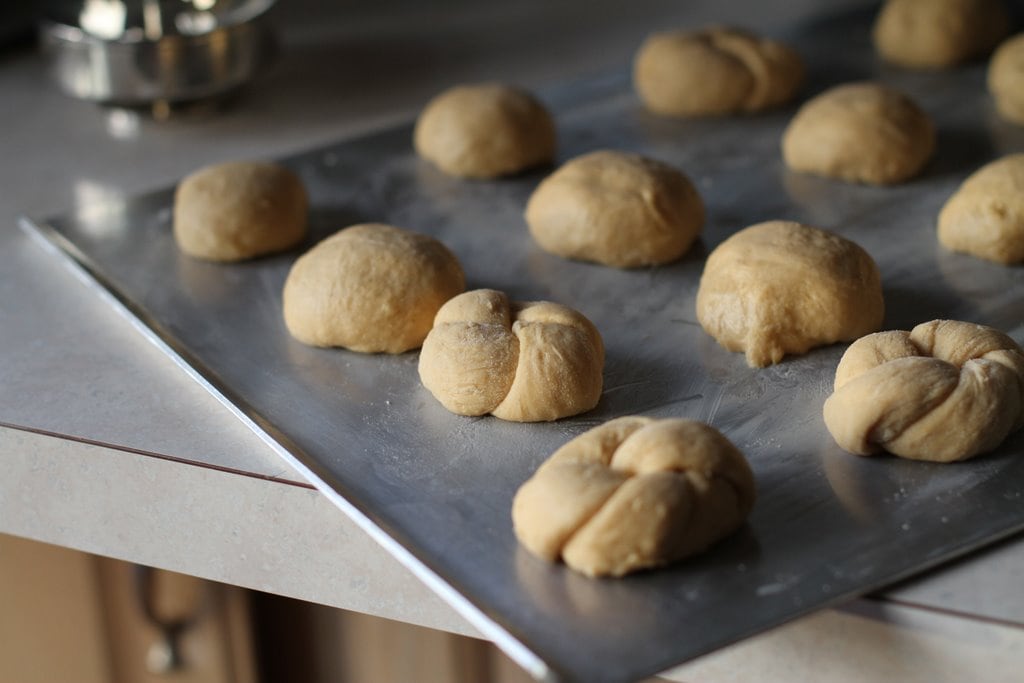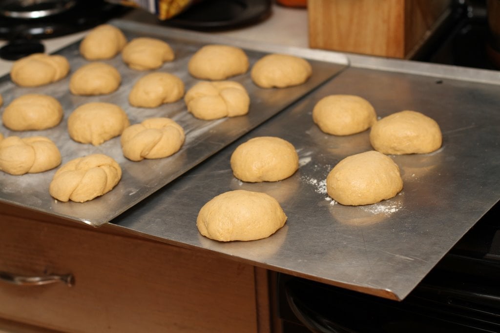 Punch the dough down, divide into 36 pieces (48 if you want smaller rolls), and shape into rolls. You can do bowknots (the process is outline in the basic roll pictures) or simple dough rounds, and you can place them on baking sheets,