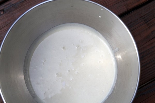 The two are combined, like usual, and the result is a pretty soupy mixture that’s more like batter. At this point, you’ll need to divide the batter in half. The batter is about 5 cups, so you should put about 2.5 cups into a separate bowl.