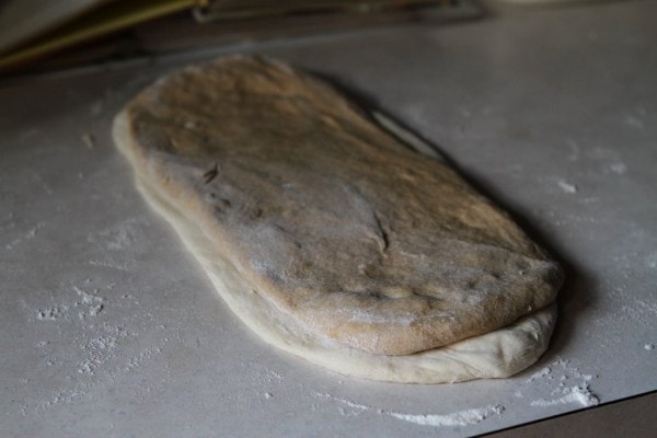 Cover both bowls with a wet tea towel and let them rise for an hour, or until they’re doubled in size. Once they’re risen, punch the doughs down and divide each in half. Roll out a whole wheat portion to a 12×8 inch rectangle, and do the same with a white portion.