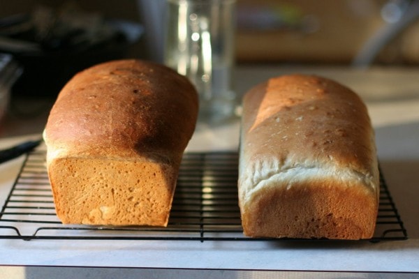 Bake the loaves in a preheated 350 ° F oven for 30-35 minutes. This bread is a little bit denser than your typical loaf, so don’t be tempted to take these out too soon or the insides will be doughy (dense bread takes longer to bake than light bread does).