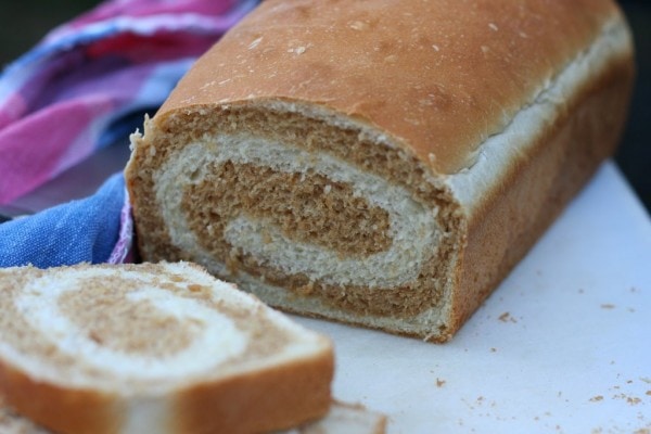 You can place the whole wheat dough on top or the white dough on top…it’s up to you. My personal preference is to put the whole wheat on the bottom, but I usually make one loaf each way!