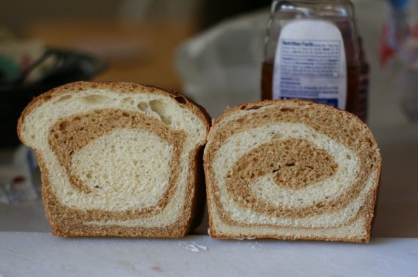 Punch doughs down and divide each in half. Roll one light half and one dark half, each to a 12×8 inch rectangle. Place the dark dough atop the light dough (or vice versa) and roll up, starting from the short end.