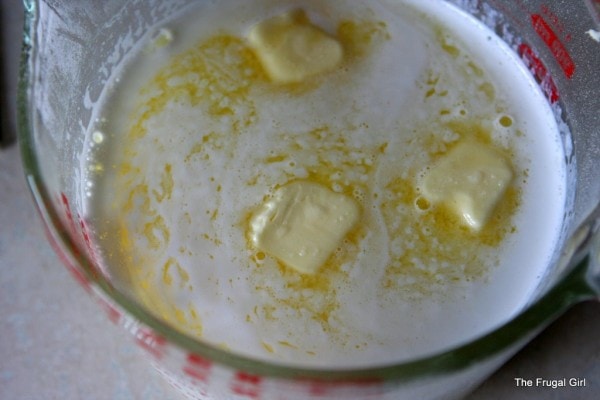 Combine the milk, sugar, butter, and salt together, and heat to 120 degrees F. The recipe calls for 1/2 cup of sugar, but you can use less if you prefer, and you can substitute honey.