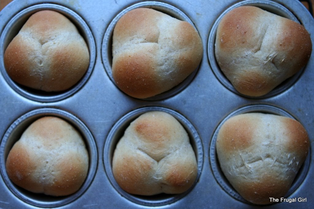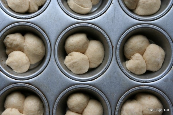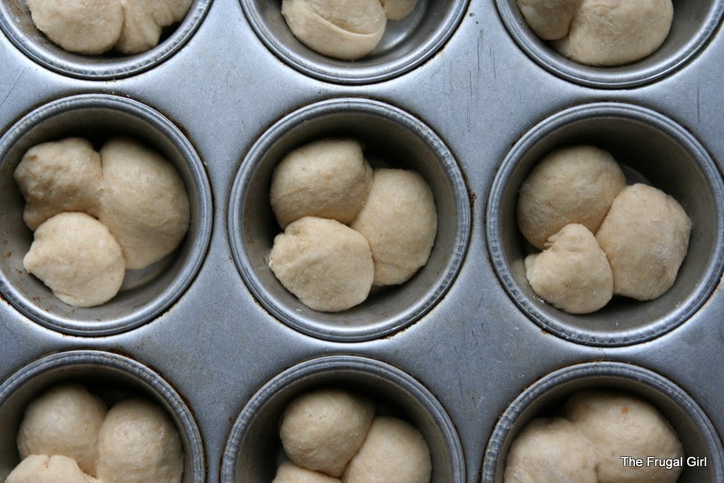 To make cloverleaves, divide each piece into 3 pieces, shape each into a ball, and place three balls into each section of a muffin tin.