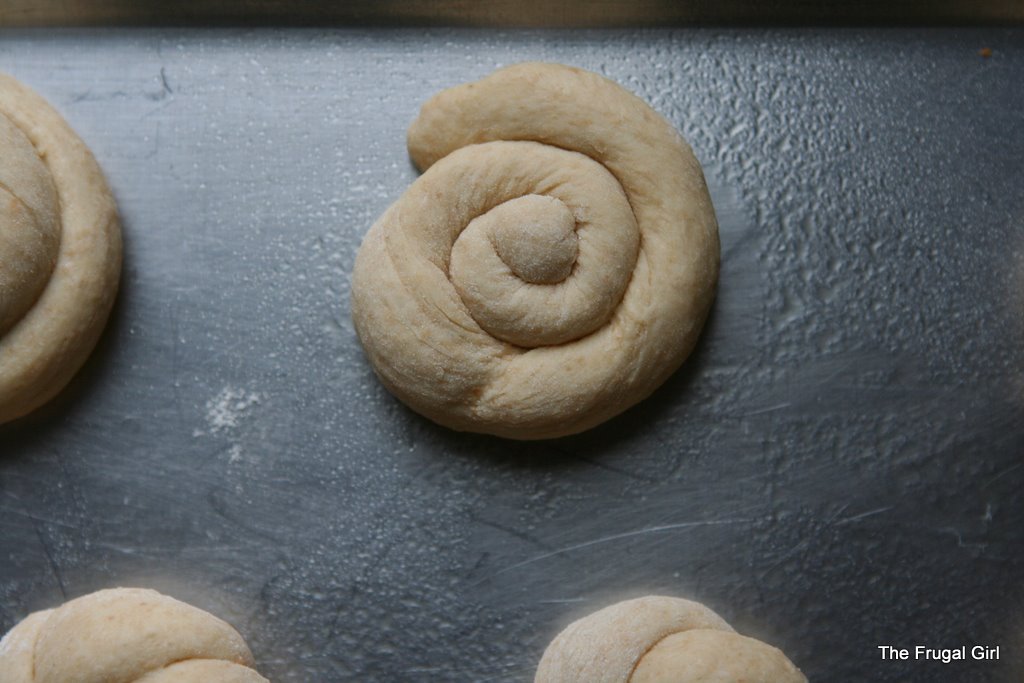To make swirls, roll each piece of dough into a 8-10 inch rope, and coil the strand into a snail-like shape.