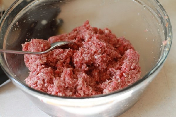 2. Add ground beef to the bread/milk mixture, and gently combine, using a fork.
