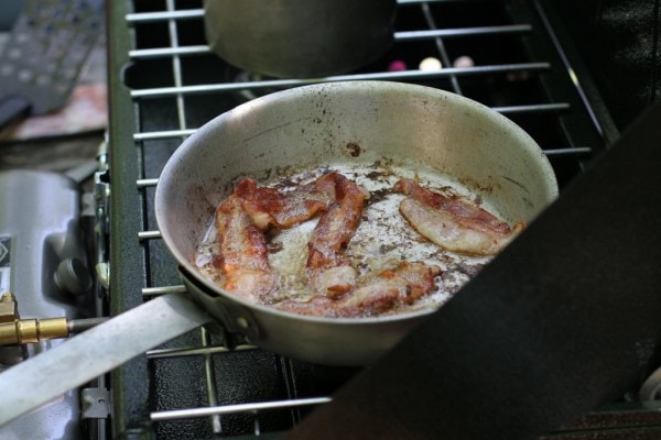 His method for cooking bacon: Put it all in the pan, then pour in enough water to come about half way up the bacon. Cover and let it boil until the bacon is cooked, 15 minutes or so. It won't be crisp at all, that comes next. Remove the lid and allow the water to evaporate, then continue cooking the bacon. This method cooks the bacon without burning it and renders out some of the fat while the water is boiling so that when the water evaporates, there's already some fat in the pan to help the bacon crisp up. Over a camp fire or camp stove when the heat is less reliable than an indoor kitchen, cooking bacon this way seems to help avoid burning!