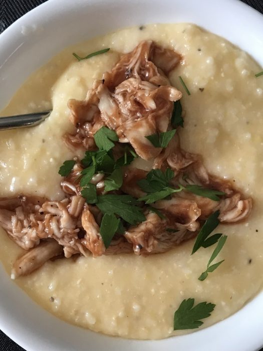 So, I made the grits from this recipe and we topped them with pulled chicken.