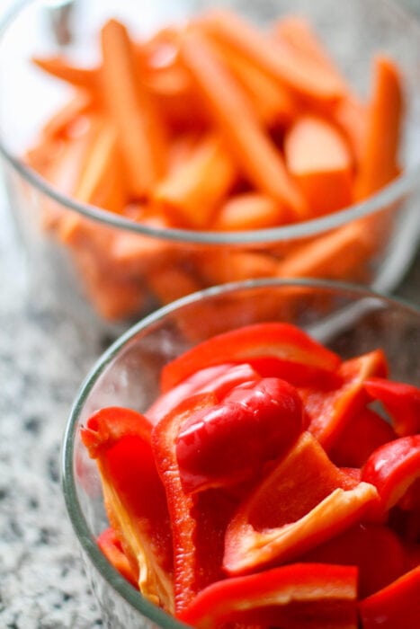 I made potato cubes too (parcooking the potatoes first is key!), and we had some kind of produce but I don’t remember what.