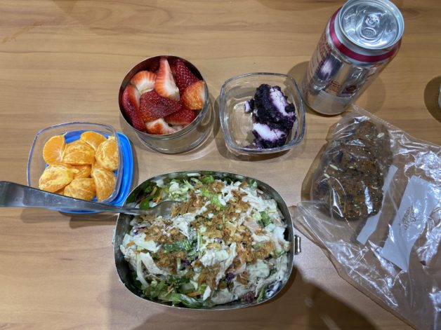 I didn’t take a picture, but I cooked some Aldi ravioli, added spinach, and also made a creamy sauce, so it was basically like this lunch I packed recently: