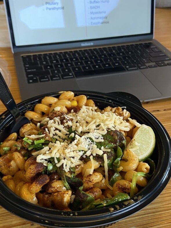 I ate at Noodles and Company with my two study companions; I had a spicy noodle bowl with chicken in it.
