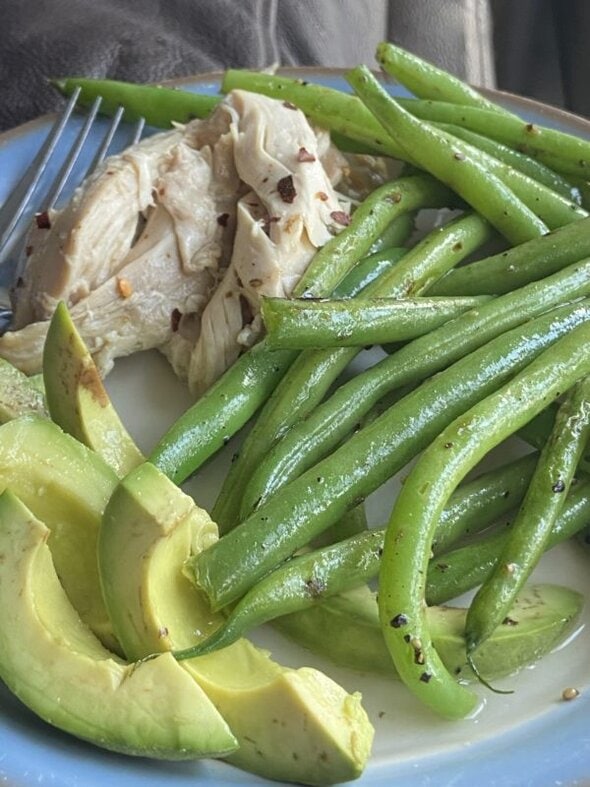 A very random meal of rotisserie chicken, sauteed green beans, and an avocado with salt and lime.