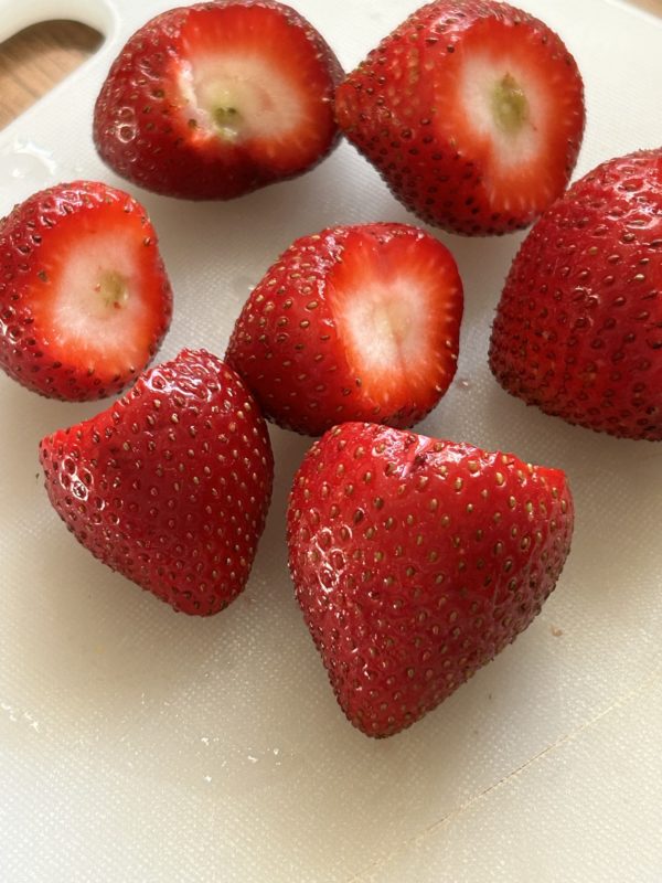 I had bought a salad kit, which I combined with some sautéed mango jalapeno chicken sausage for an easy dinner; strawberries on the side.