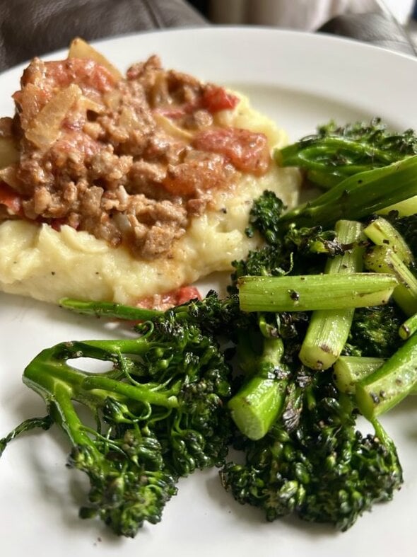 I made mashed potatoes and topped them with a mixture of sautéed tomatoes, onions, and spicy sausage. On the side, sautéed baby broccoli.