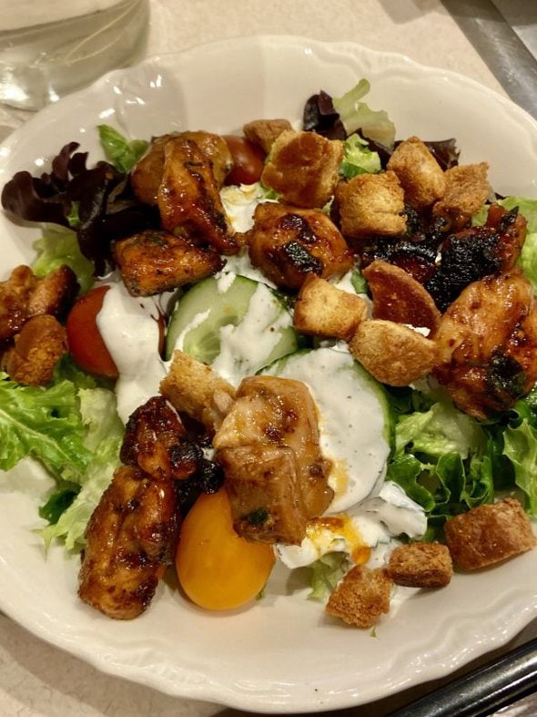 I got some chicken thighs out of the freezer, used my trusty chipotle marinade and accompanying sauce, and made a salad for the two of us, topped with homemade croutons.